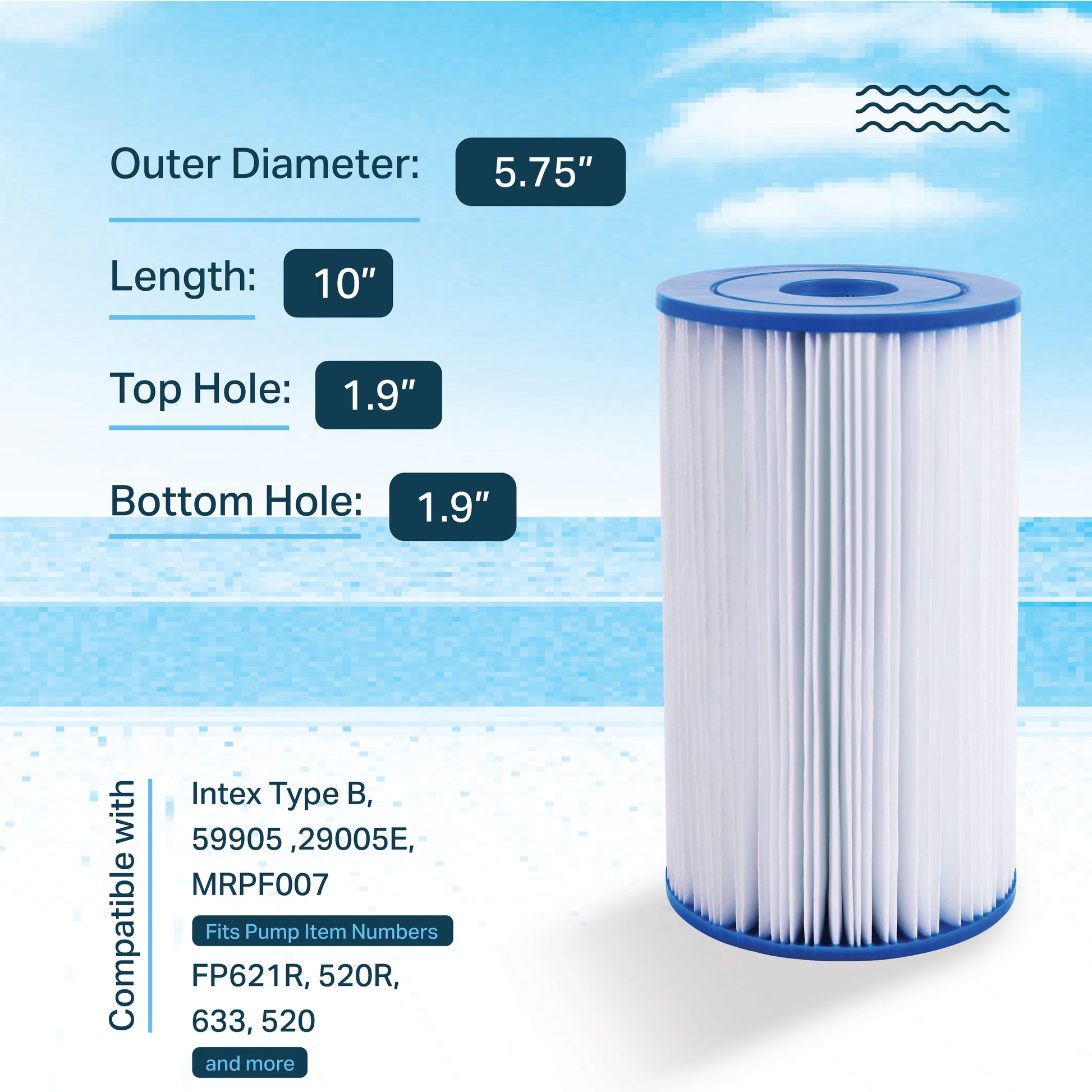| Replaces | Pleatco PA120, Unicel C-8412, Filbur FC-1293 and other OEM parts CX1200RE, 817-0125N | Pleatco PCC105, Unicel C-7471, Filbur 1977 and other OEM parts 817-0131, 178584, R173476, 817-0106 | Pleatco PRB50-IN, Unicel C-4950, Filbur FC-2390, and other OEM parts 03FIL1600, 17-2380, RTL-50, 100533, 6540-471, 25391, 817-5000, R173434 | Pleatco PRB25-IN, Unicel C-4625, Filbur FC-2375 and other OEM parts 17-2327, 100586, 817-2500, R173429 | Pleatco PWW50P3, Unicel 6CH-940, Filbur FC-0359 and other OEM parts 817-0050, 03FIL1400, 25252, 378902, PWW50 | Intex Type A or C, 29000E, 59900E, For filter pump item numbers: RX & SFX 1000, RX & SFX 1500, RP & SFS 700/800, RP & SFS 1000, RP & SFS 1500, Krystal Clear 02 & 12R | Intex Type B, 59905, 29005E For filter pump item numbers: FP621R, 520R, 633, 520, 51, 59901e, 59905E 56633, 56634, 56621, 56622, 56611, 56612 |