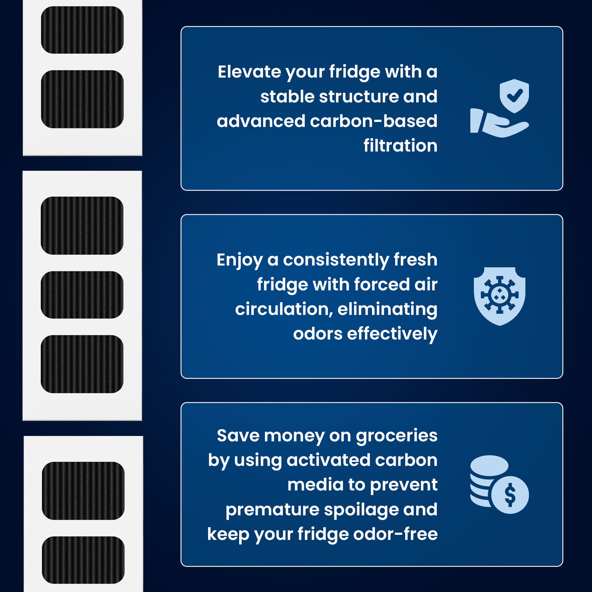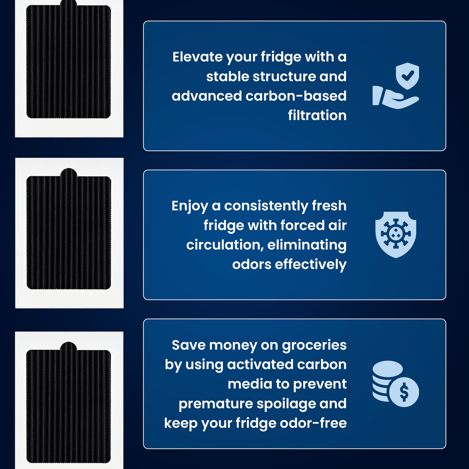 Our high-quality activated carbon air filters work to trap large and small impurity particles as well as chemicals in their highly absorbent pores - leaving your refrigerator contaminant and pollutant free.